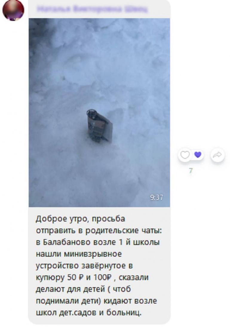 — Просьба отправить в родительские чаты: в Балабаново возле 1-й школы нашли мини-взрывное устройство, завёрнутое в купюру 50 и 100 рублей. Сказали, делают для детей (чтоб дети поднимали), кидают возле школ, детсадов и больниц, — говорится в сообщении из странной рассылки.
