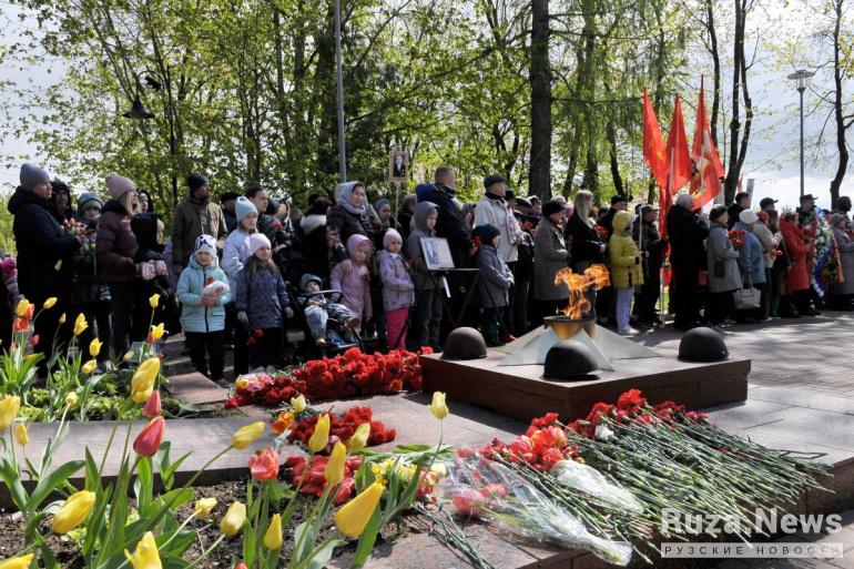 Здесь собралось большое количество жителей, чтобы почтить память героев Великой Отечественной войны
