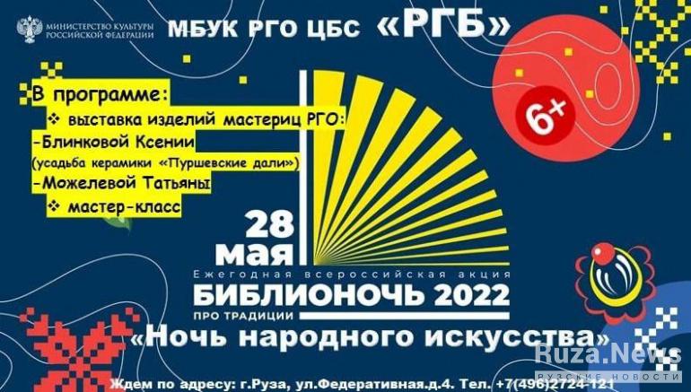 В рамках Всероссийской акции в поддержку чтения «Библионочь-2022» в Рузской городской библиотеке 28 мая с 16:00 до 18:00 пройдёт познавательно-досуговая программа «Ночь народного искусства» — Библионочь-2022.