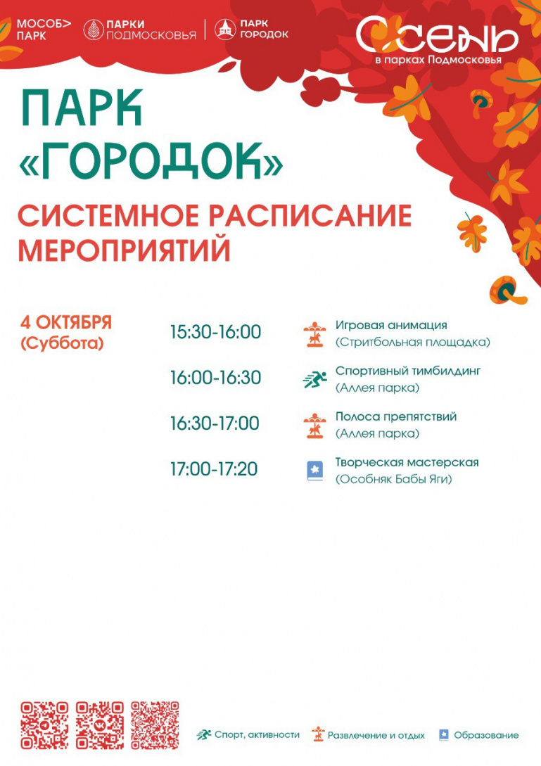 В 15:30 на стритбольной площадке пройдёт игровая анимация для детей. Затем на главной аллее парка организуют спортивный тимбилдинг и полосу препятствий. День завершится творческой мастерской в особняке Бабы Яги.