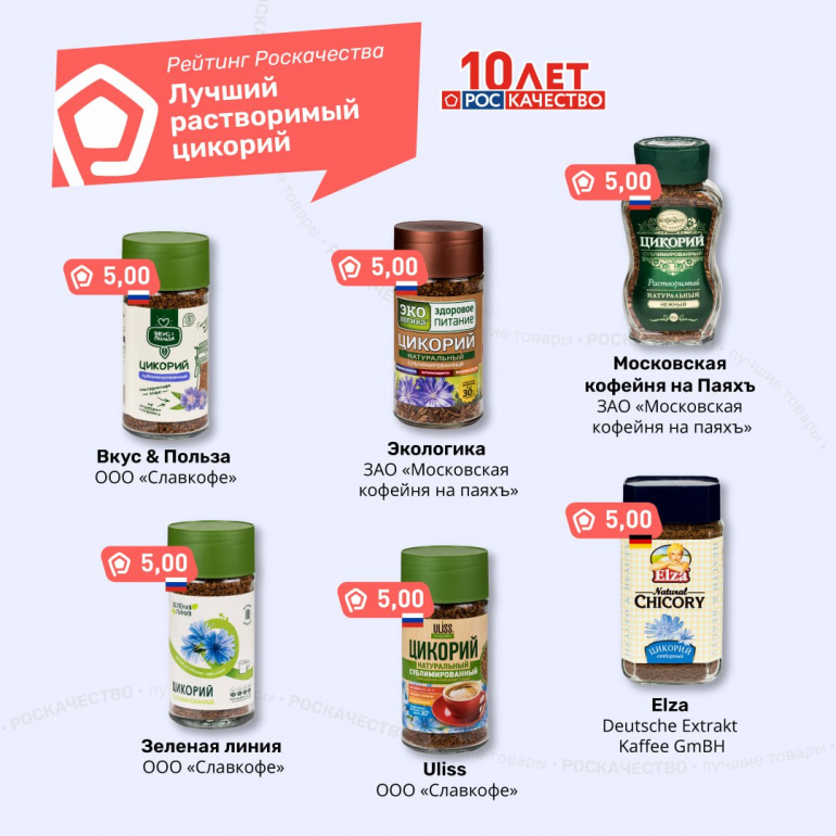 По итогам проверки высшие оценки получили шесть торговых марок: Elza, «Экологика», «Московская кофейня на паяхъ», «Вкус & Польза», «Зеленая линия» и Uliss. Они признаны безопасными, соответствующими стандартам и содержат высокое количество инулина — вещества, которое делает цикорий полезной заменой кофе.