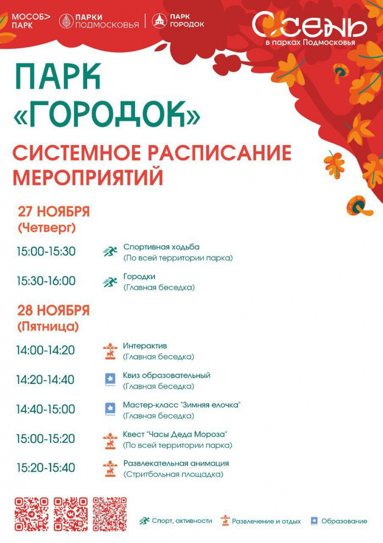 В четверг жители Рузского округа смогут принять участие в спортивной ходьбе, а в пятницу посетителей парка ждут образовательный квиз, мастер-класс «зимняя ёлочка», квест «часы Деда Мороза» и развлекательная анимация.