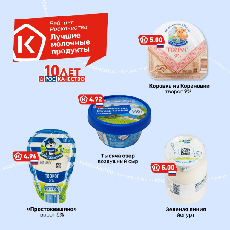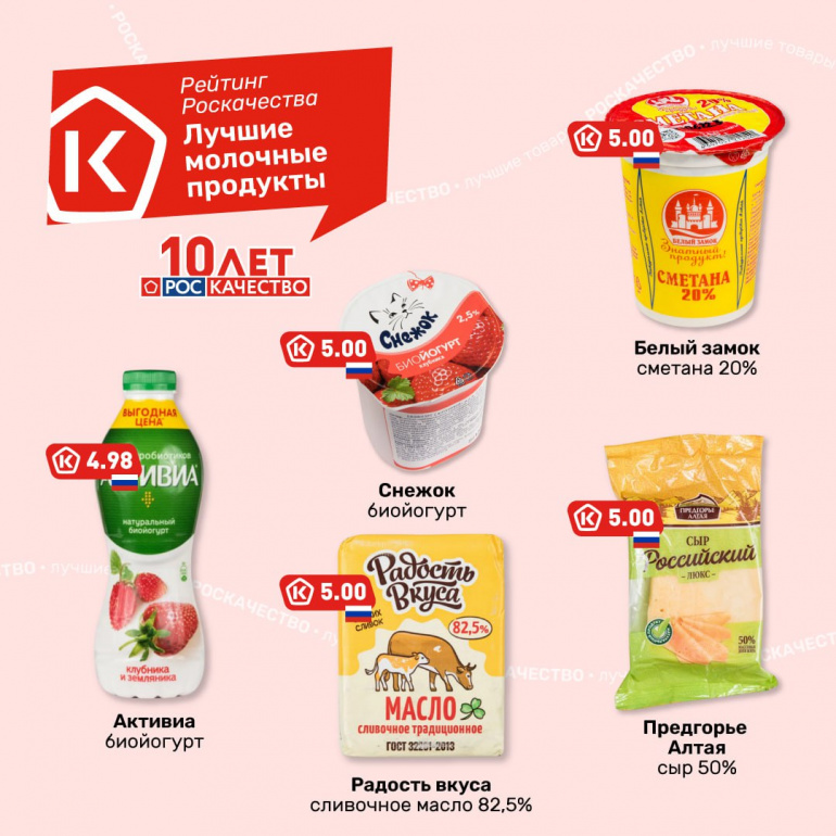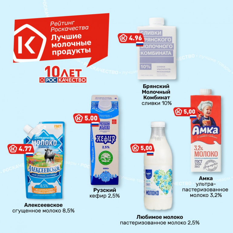 В рейтинг лучших молочных продуктов сливки «Брянский молочный комбинат», сгущённое молоко «Алексеевское», кефир «Рузский», молоко «Амка», биойогурт «Активиа», сливочное масло «Радость вкуса», творог «Простоквашино» и прочая еда.
