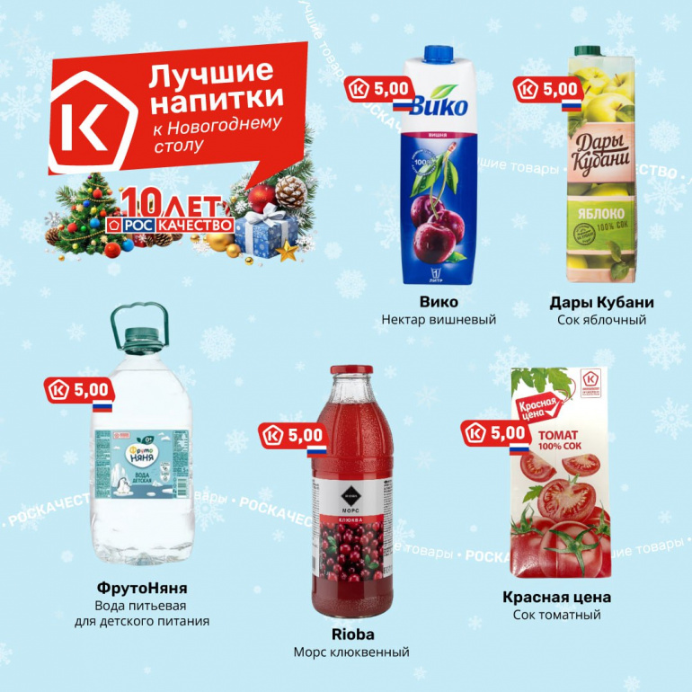 На праздничный стол эксперты рекомендуют поставить вишнёвый нектар «Вико», яблочный сок «Дары Кубани», клюквенный морс «Rioba» и томатный сок «Красная цена».
