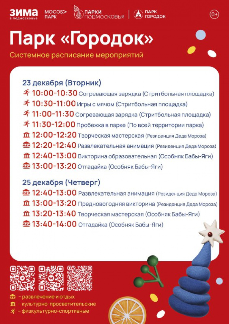 Утро вторника, 23 декабря, в парке начнётся с согревающей зарядки, которая плавно перетечёт в игры с мячом. Затем для гостей проведут творческую мастерскую, развлекательную анимацию, а в особняке Бабы Яги — увлекательную викторину.