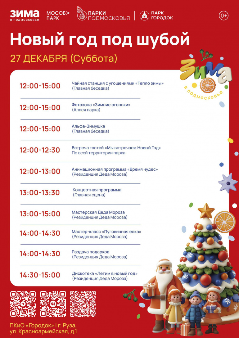 В субботу, 27 декабря, жителей приглашают не предновогоднюю вечеринку в рузский парк «Городок». Здесь каждый сможет угоститься горячим чаем, сделать памятные фотографии и потанцевать. Публикуем афишу всех событий этого дня.