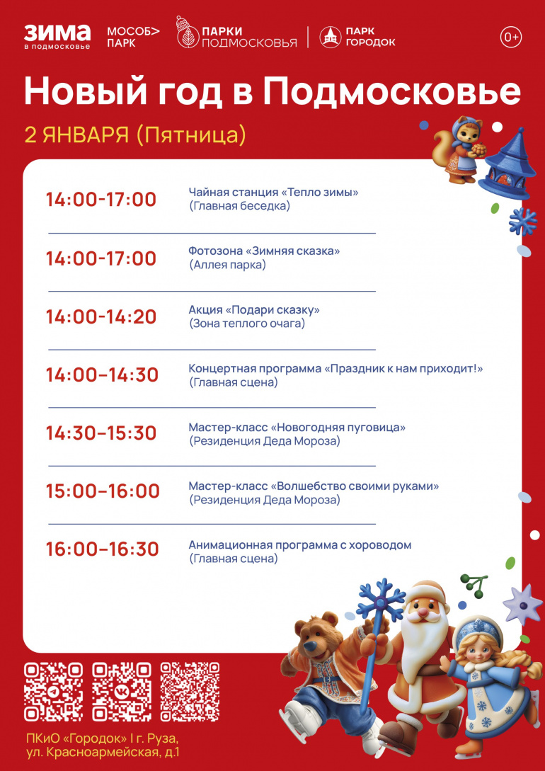 В пятницу, 2 января, жителей приглашают отметить начало нового 2026 года с сотрудниками рузского парка «Городок» за чашкой горячего чая и праздничным концертом. Какие ещё мероприятия ожидают гостей в этот день, рассказываем.