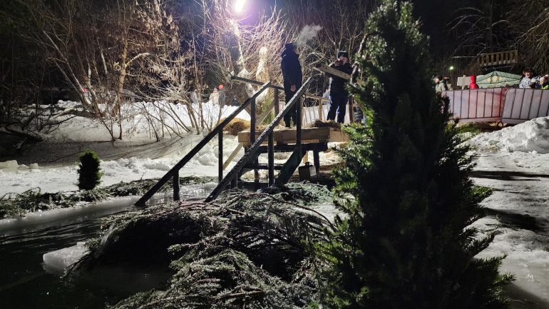 Территорию вокруг проруби застелили еловыми ветками