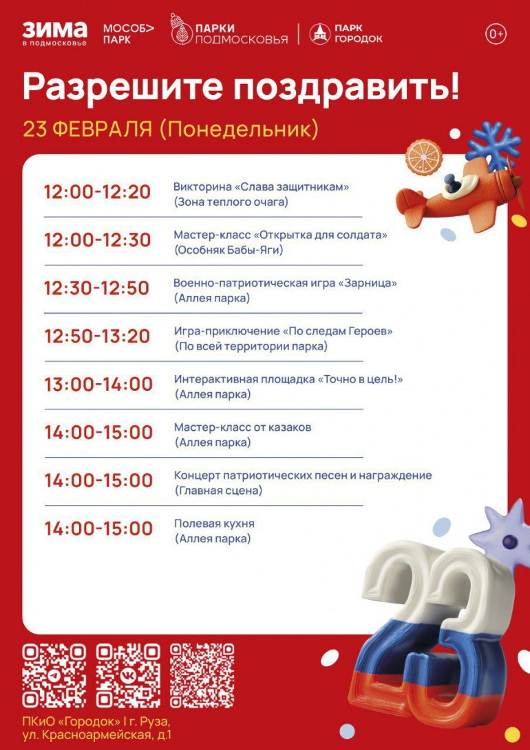 В понедельник, 23 февраля, всех жителей Рузского округа приглашают в парк «Городок», чтобы отпраздновать День защитника Отечества. В программе — мастер-классы, игры, концерт, полевая кухня и выставка. Ознакомиться с афишей всех развлечений можно ниже.