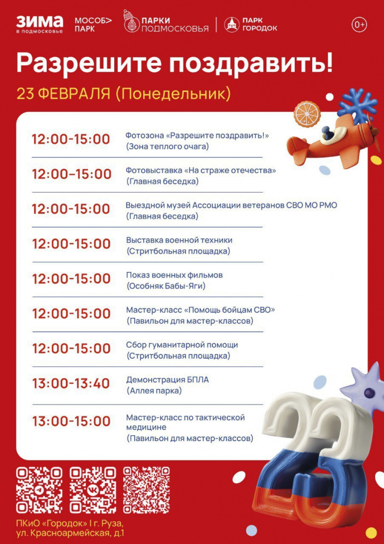 С 12:00 до 15:00 в зоне тёплого очага будет работать фотозона, а в главной беседке — фотовыставка «На страже Отечества». На стритбольной площадке развернут выставку военной техники. Тут же организуют сбор гуманитарной помощи для участников специальной военной операции. В 12:00 в особняке Бабы Яги можно посмотреть военные фильмы. В 13:00 на аллее парке пройдёт демонстрация беспилотных летательных аппаратов.