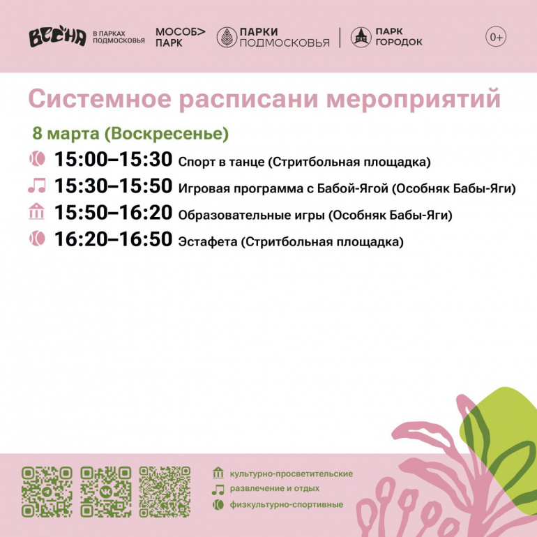 Празднование начнётся в 15:00 со спортивных танцев на стритбольной площадке парка. Затем в особняке Бабы-яги пройдёт игровая и образовательная программа. Мероприятие завершится в 16:20 эстафетой.