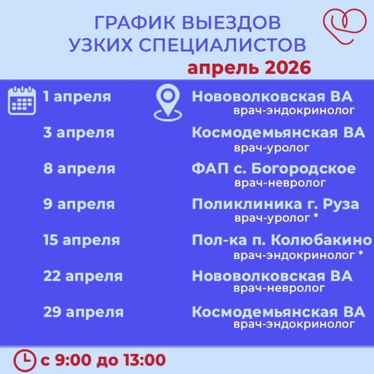 Рузская больница опубликовала график выездов узких специалистов на апрель. В какие дни врачи приедут к жителям населённых пунктов, рассказываем.